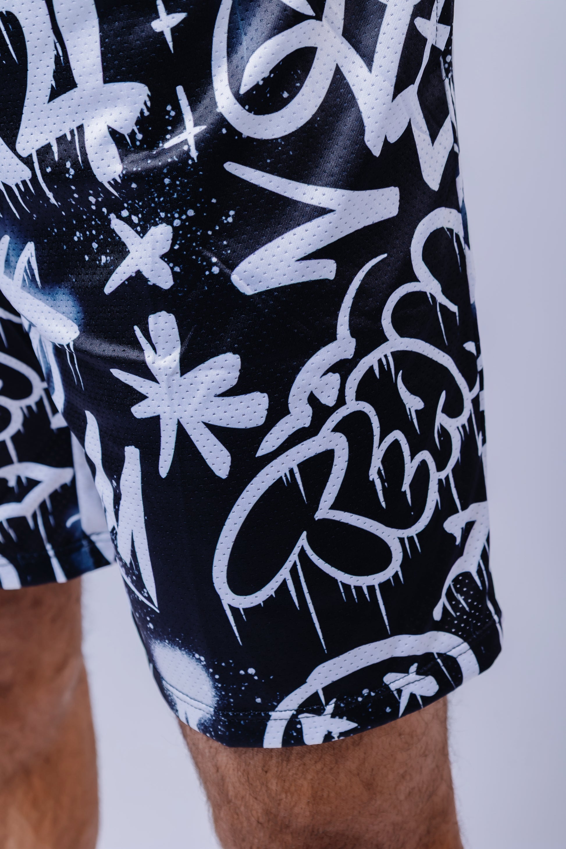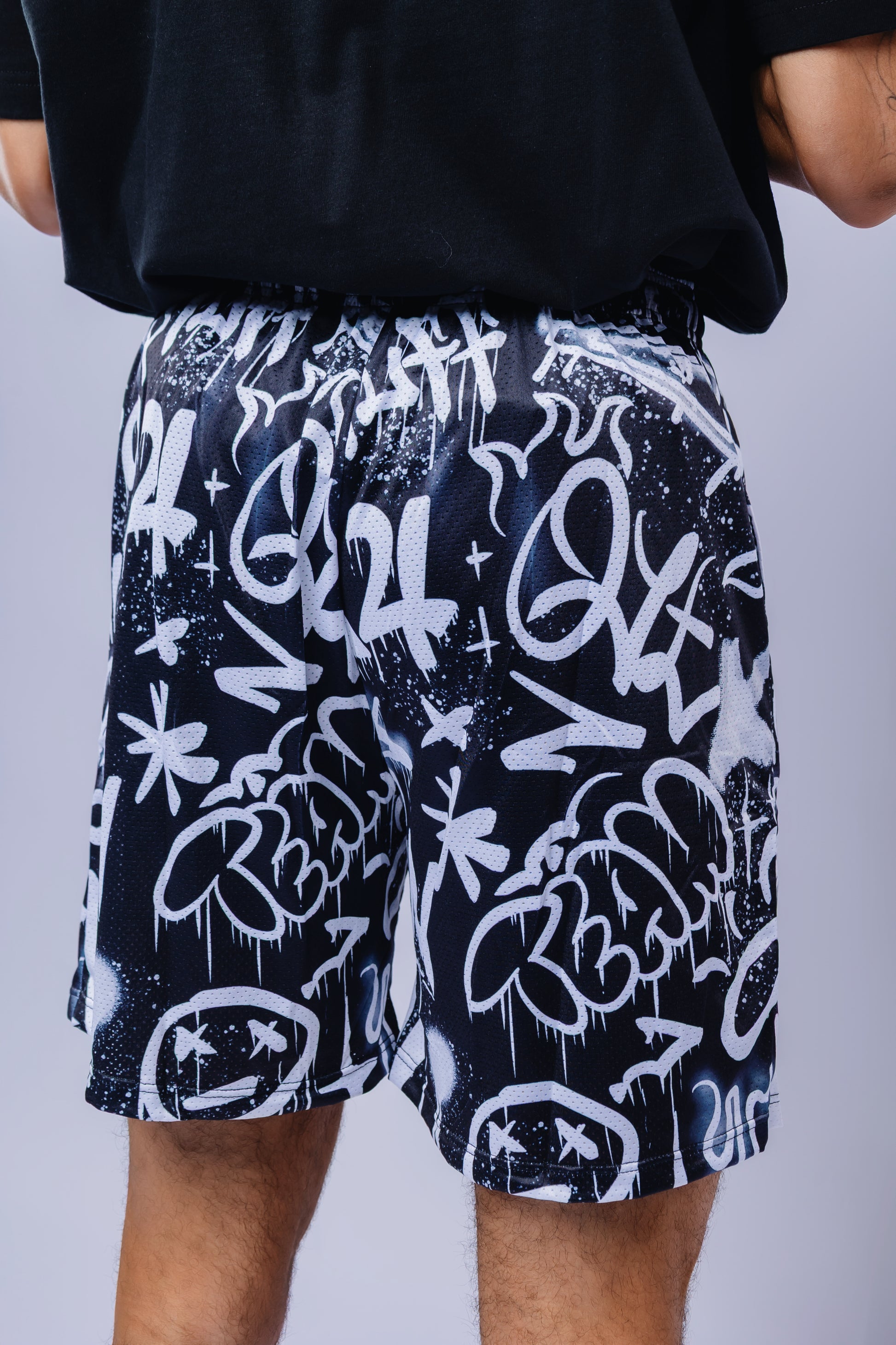 Make a bold statement in the 24 Apparel Graffiti Mesh Shorts, where street art meets sport. These white mesh shorts feature an all-over black graffiti-style print, blending raw creativity with urban edge. Every tag, crown, and symbol represents individuality, hustle, and expression—hallmarks of the 24 lifestyle.